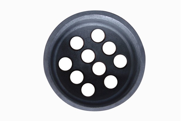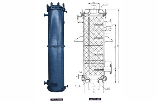 YKA型圓塊式石墨熱交換器以圓柱 體型單元積木式疊裝而成,結構強度高,石墨件間墊以四氟質或特種橡膠質等質 地密封件.密封可靠,設備導熱效率高,耐溫、抗沖擊、耐壓等性能優越。本型設備分成I型與II型,I型載熱體切向進入換熱塊,相鄰兩塊方向錯開,縱向物料經短 通逐塊再分配而紊流效應顯著,下封頭附 加氣液分離的則成冷凝器,若上封頭改成 蒸發室則形成蒸發器。YKA-II型載熱體徑 向進入換熱塊,殼體按外折