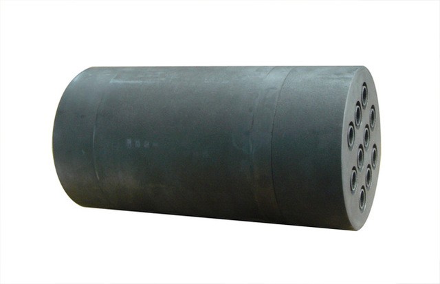 該系列型圓塊孔式石墨換熱器為目前較為先進、性能較優越的一種設備, 采用先進的加工工藝制作。圓柱體換熱塊 采用標準單元塊,在石墨塊上鉆有兩組不相通的流道,且相互成直角。石墨件間采 用聚四氟乙稀密封,加裝壓力彈簧作熱脹 冷縮自動補嘗裝置,具有結構強度高,耐 溫耐壓性能強.抗沖擊性能好,傳熱效率 高、使用壽命長、便于檢修等優點。本系列產品可用作加熱器、冷卻器、冷凝器。作冷凝器用時底部需要加裝氣液分離器,