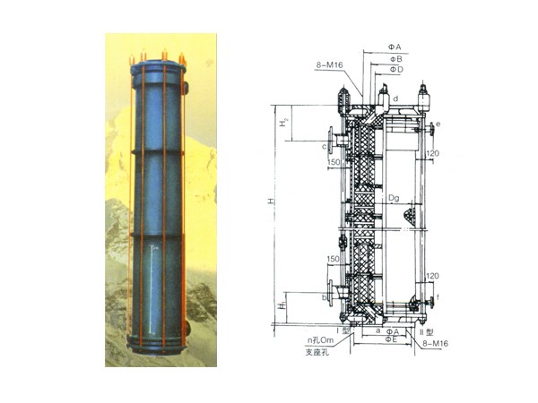 本型設備由單元吸收換熱塊積木式疊裝,塊間加四氟質(或特種橡膠質)密封墊。上部為氣體與吸收液進入及分布裝置底部為氣液分離器,輔以通流冷卻水 的鋼質殼體構成。結構強度高,抗熱沖擊 性好,傳熱效率高,檢修方便。YKX型只許輔以支座(用戶自配)安裝,MS型以 殼體上懸掛支座安裝。圖示為圓塊式石墨吸收器結構圖。技術特性: 縱向 橫向設計壓力Mpa ≤0.1 ≤0.4設計溫度℃ ≤170換熱面積㎡