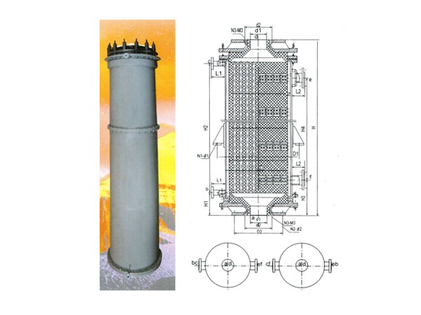 圓塊孔式石墨硫酸稀釋冷卻器由石墨制混酸器與圓塊孔式石墨冷 卻器組合而成,亦可用作其它物料放熱性 稀釋、混合、冷卻。本公司亦生產LS型石墨硫酸稀釋冷卻器及混酸與冷卻分體之I型、II型組合硫酸稀釋冷卻系統。圖示為冷卻器結構圖。技術特性: 縱向 橫向設計壓力Mpa ≤0.1 ≤0.4設計溫度℃ -20 ~ 165 (按中徑計)換熱面積㎡ HG/T3188-2000技術標準:HG/T318